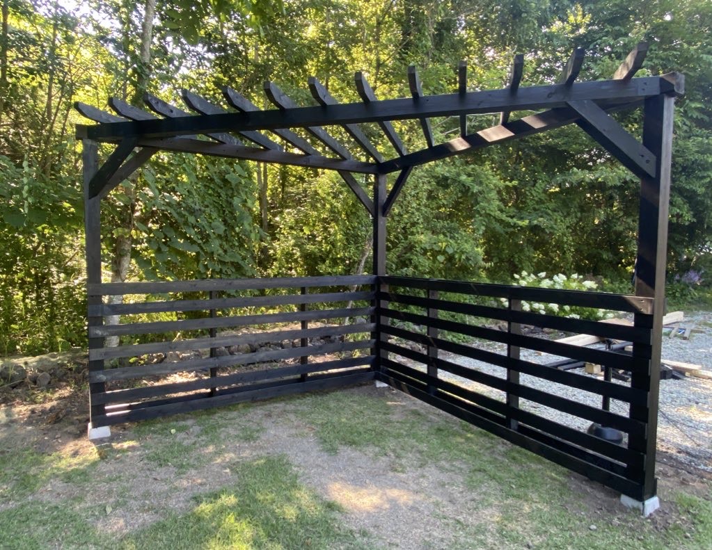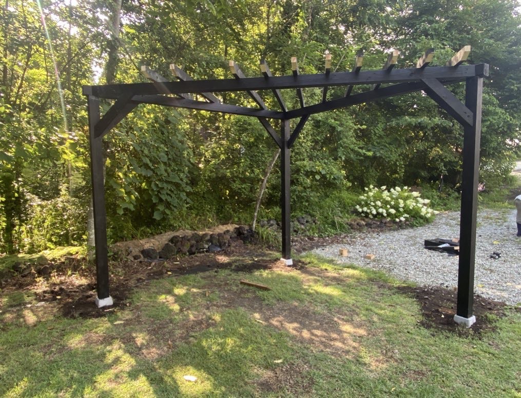 完成したパーゴラは、これから軽井沢の四季折々の風景に溶け込み、庭の新たなシンボルに。